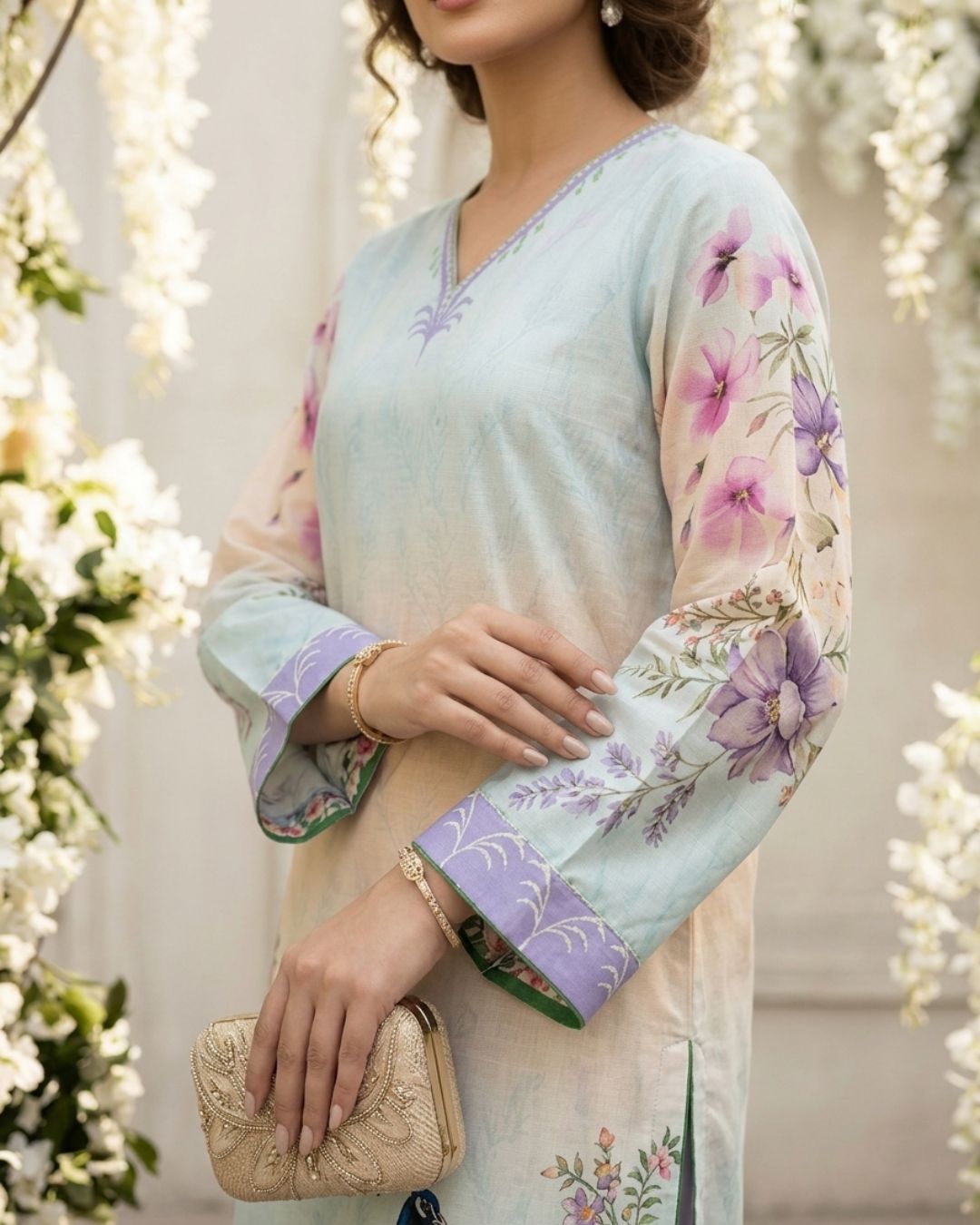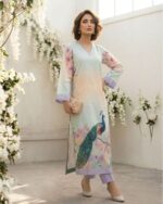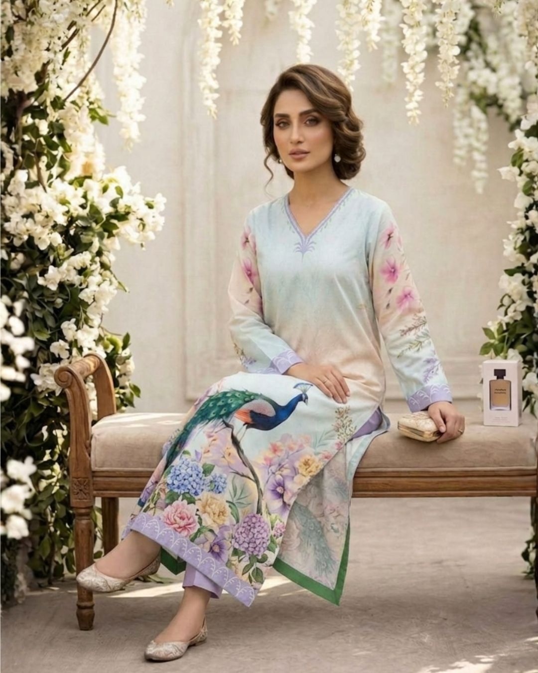 Elegant and comfortable Peacock Pastel Kaftan made from premium Silky Lawn fabric. Designed with a luxury look and relaxed fit, perfect for Eid, festive occasions, and everyday wear.
